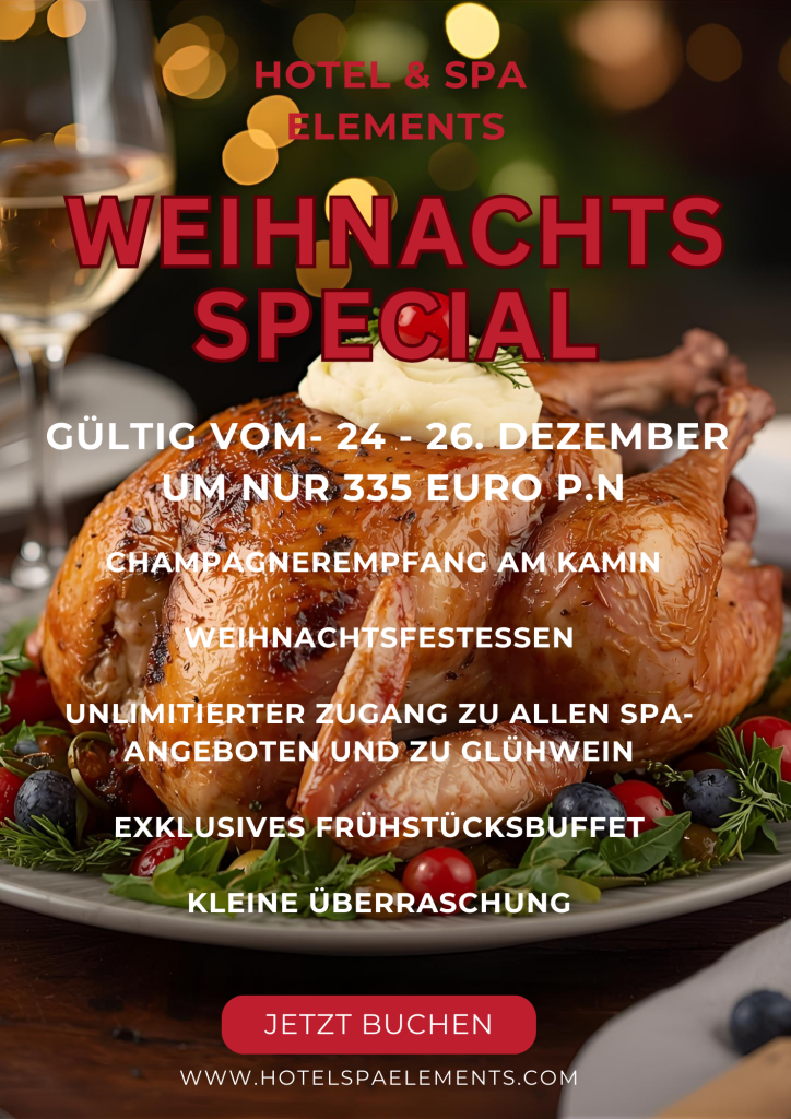 Vom 24. bis zum 26. Dezember bieten wir ein Weihnachtsspecial an! Sie erwartet ein Champagnerempfang, ein Weihnachtsessen und der Unlimitierte Zugang zu unseren Spa – Angeboten